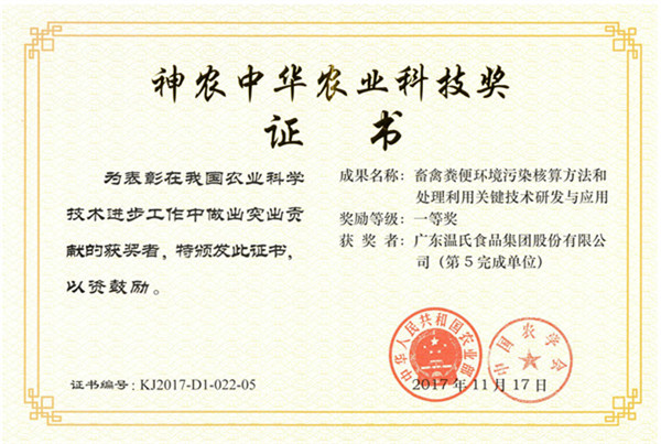 神农中华农业科技奖一等奖-尊龙官方股份《畜禽粪便情形污染核算要领和处置惩罚使用要害手艺研究与应用》