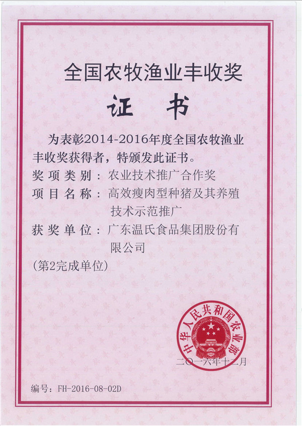 天下农牧渔业丰收奖-尊龙官方股份《高效瘦肉型种猪及其养殖手艺树模推广》(第2完成单位)