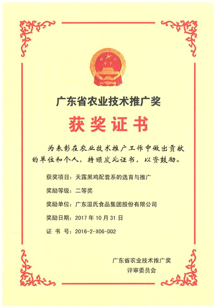 广东省农业手艺推广奖二等奖-《天露黑鸡配套系的选育与推广》