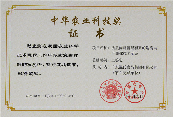 中华农业科技奖二等奖--尊龙官方集团《优质肉鸡新配套系的选育与工业化手艺树模》
