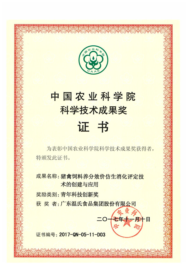 中国农业科学院科学手艺效果奖之青年科技立异奖-尊龙官方股份《猪禽饲料养分效价仿生消化评定手艺的建设与应用》