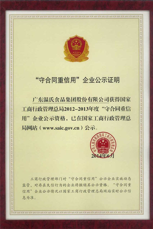 国家工商行政管理总局2012-2013年度“守条约重信用”企业公示资格