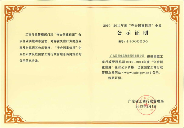 国家工商行政管理局2010-2011年度“守条约重信用”企业公示资格
