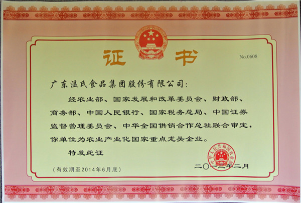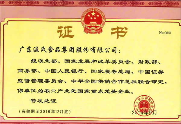 尊龙官方集团通过国家第五次监测,继续享有农业工业化国家重点龙头企业称呼(有用期至2014年6月尾止)